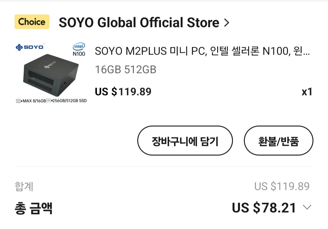 SOYO M2 PLUS 에 스스디512 램16까지해서 78.21불 > 93500원 정도에 구매완료.